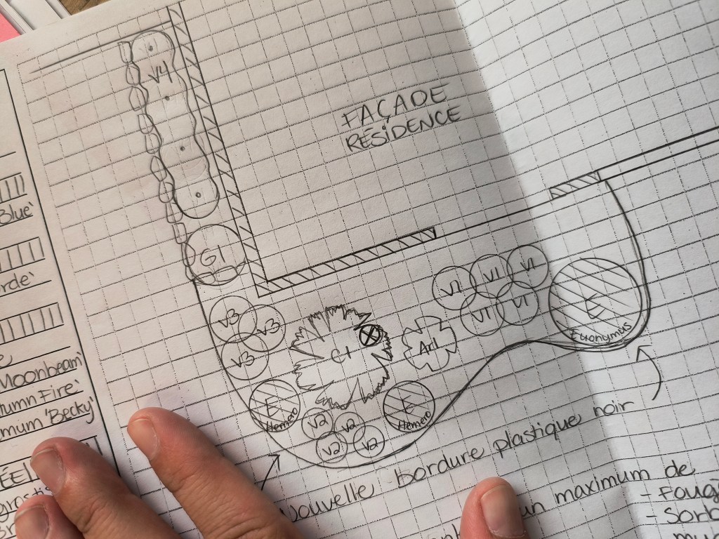 Visite conseil et plan d’aménagement de plate-bande, en noir et blanc, format 8,5 par 11 pouces, incluant la liste de végétaux en latin, l’estimé des coûts de réalisation de travaux, envoi par courriel, conseils sur l’entretien,