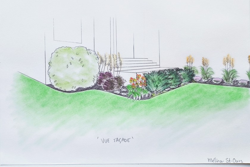 Visite conseil en personne et plan d’aménagement de plate-bande, en couleur, format 11 par 17 pouces, incluant une élévation en couleur, la liste de végétaux en latin, l’estimé des coûts de réalisation de travaux avec possibilité de phases de travaux sur plusieurs années, présentation du plan en personne avec photos des végétaux,